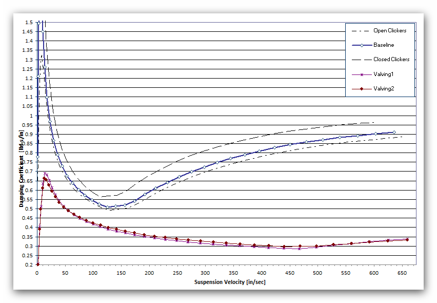 Baseline is the stock shock, Valving 1 is the HRS revalved stock shock, Valving 2 is the Racetech Gold Valve shock.